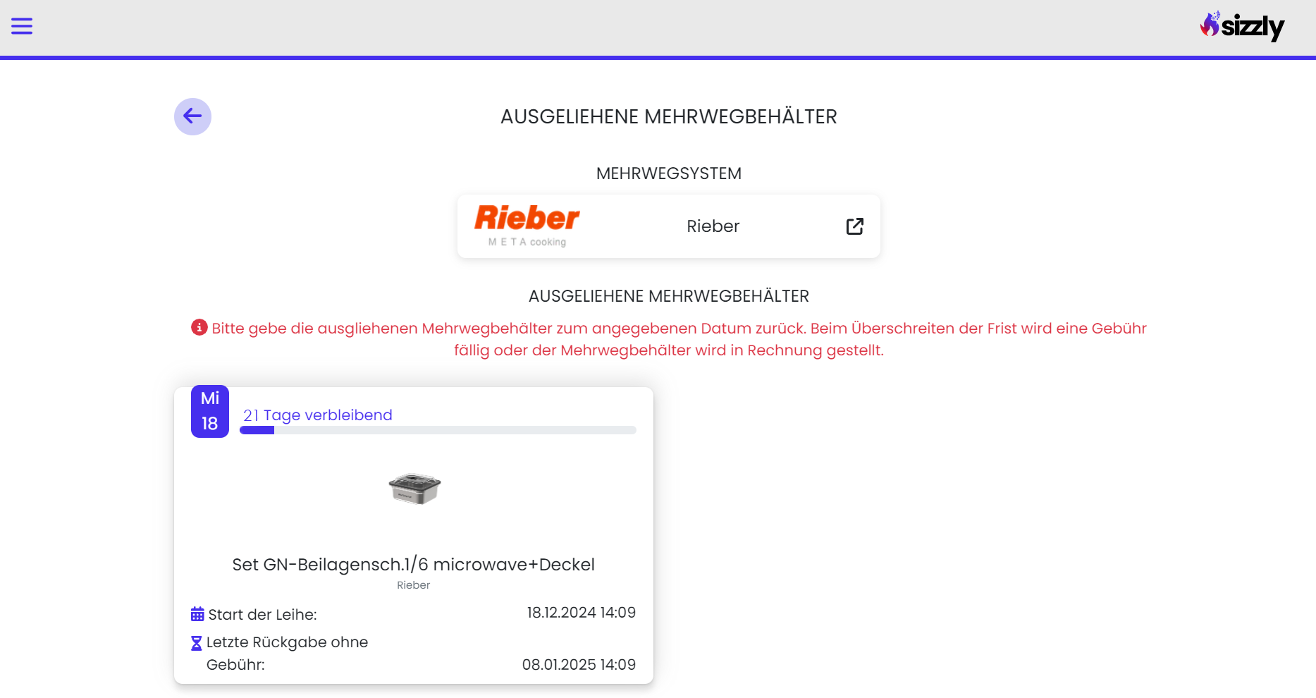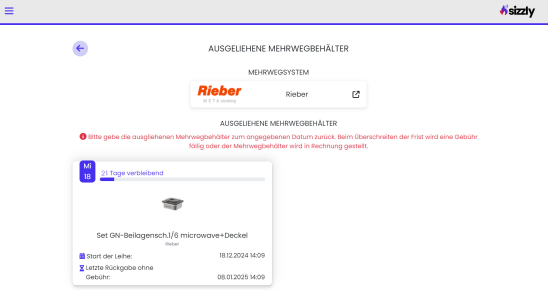 Wie viel Zeit dir für die Rückgabe noch bleibt, kannst du jederzeit in deinem Sizzly-Account einsehen. Die Registrierung erfolgt über deine Geschäftsmailadresse. Wenn du diese Anwendung nicht nutzen möchtest, ist das kein Problem: Du erhältst auch eine Erinnerungs-Mail für die Rückgabe.